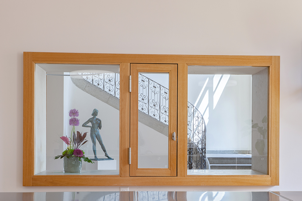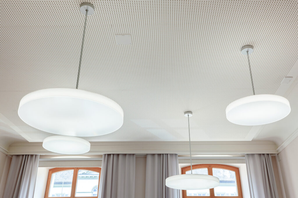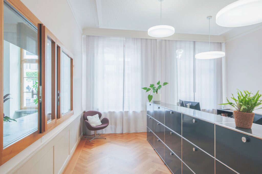 Der Empfang des Regierungsgebäudes wurde in enger Absprache mit der Denkmalpflege neu konzipiert. Der historische Boden wurde aufbereitet und ergänzt, alle Oberflächen erneuert, die Beleuchtung ersetzt und die Möblierung neu gestaltet.