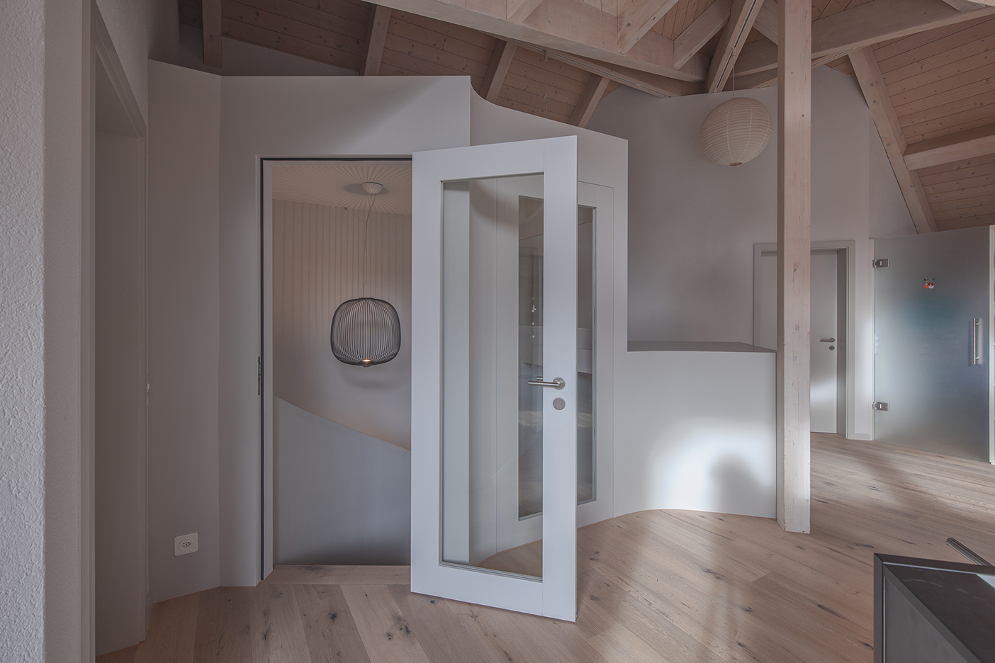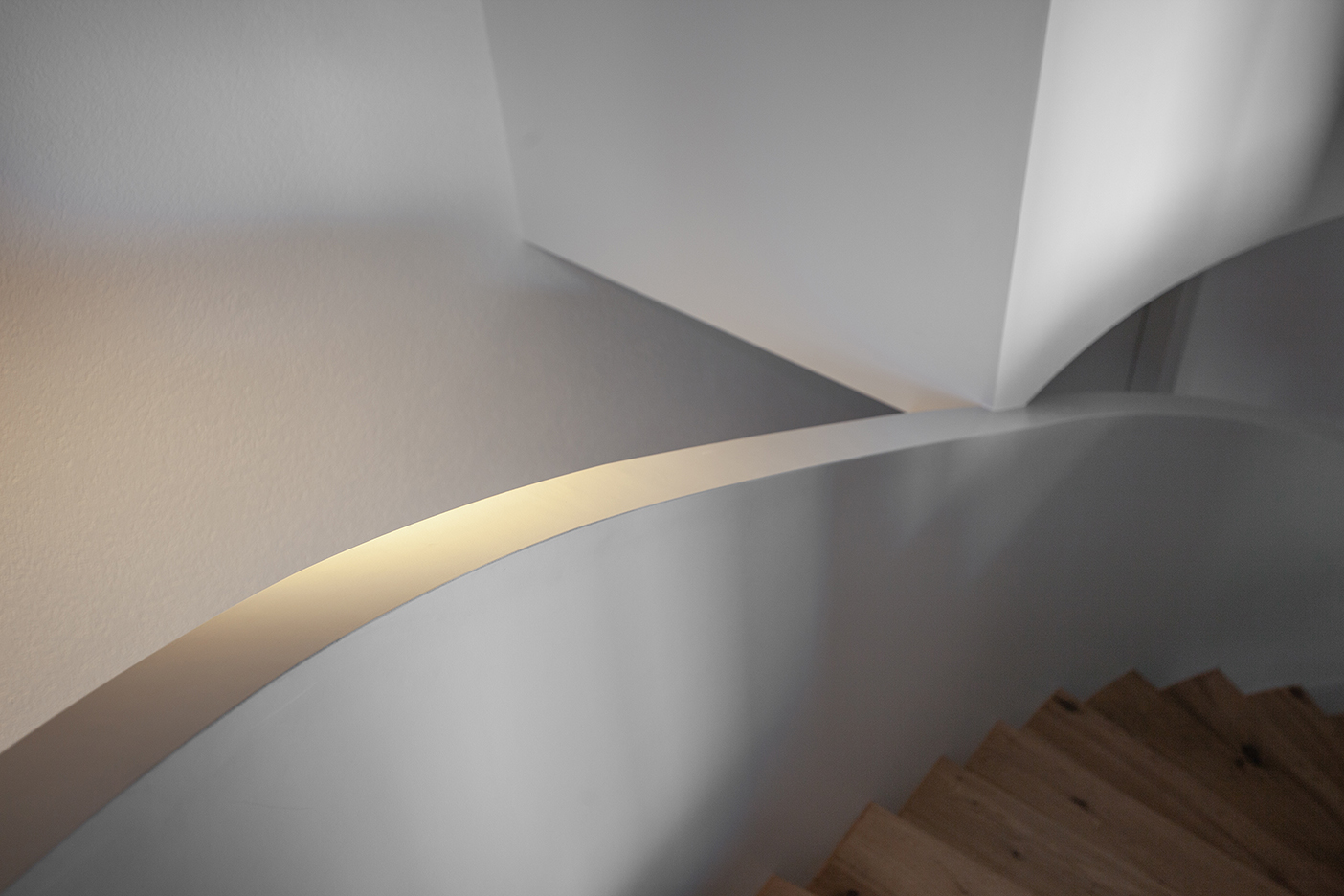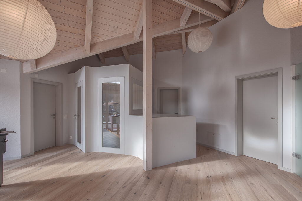 Eine wahrhaft nicht alltägliche Aufgabe war zu lösen: bei einem grosszügigen Einfamilienhaus sollten die zwei Wohngeschosse, die durch eine offene Holztreppe verbunden war, akustisch getrennt, aber weiterhin visuell offen gestaltet werden. Was zuerst fast unmöglich klang, wurde zu einem skulpturalen Treppenumbau, der dann alle – Handwerker, Planer und Bauherrenfamilie – begeistert hat!