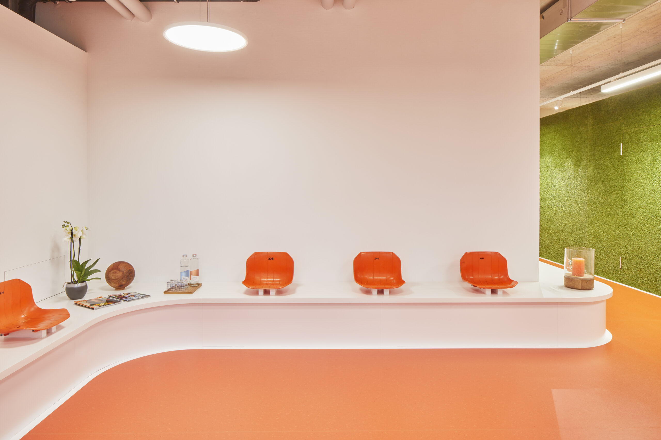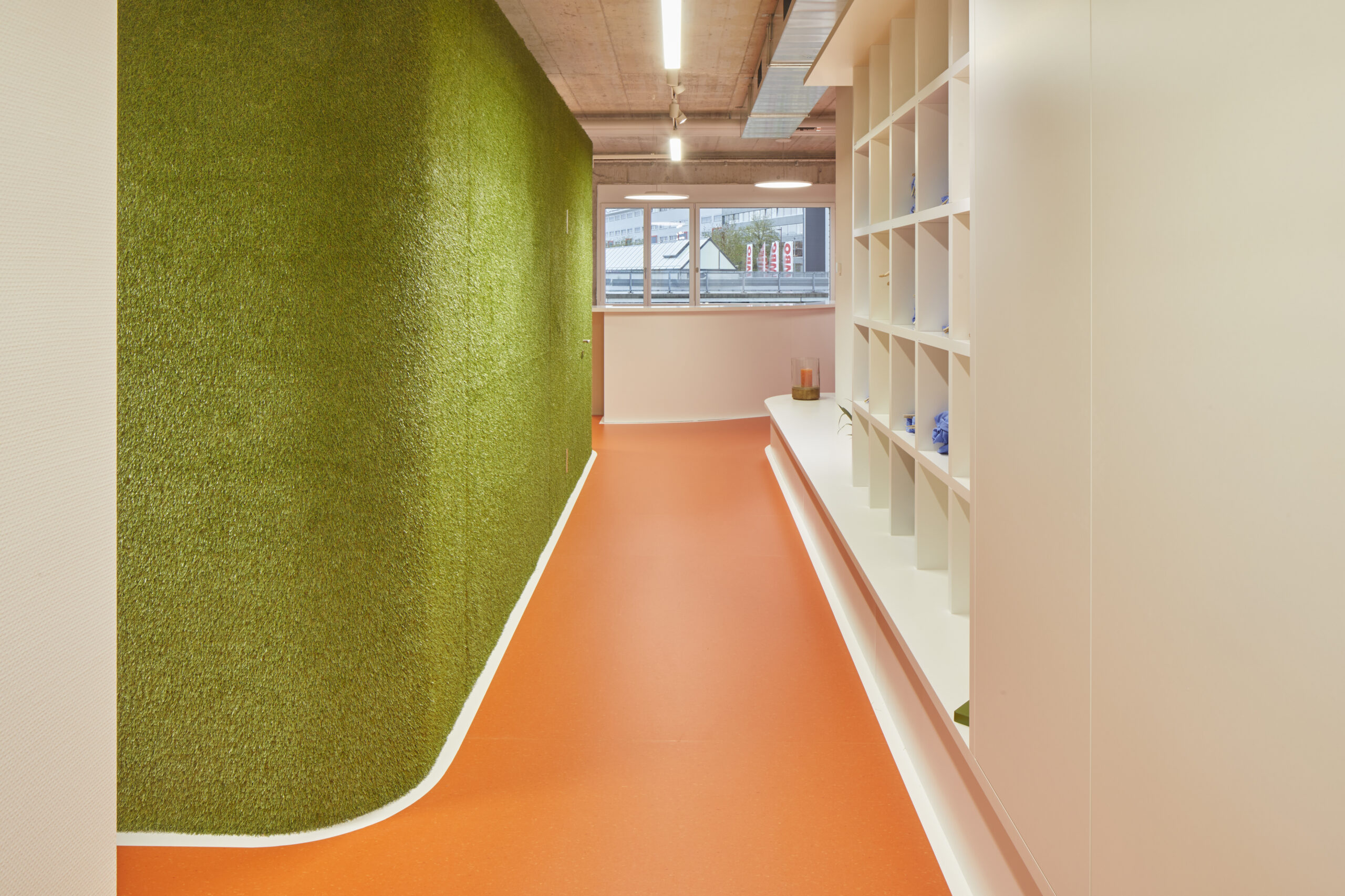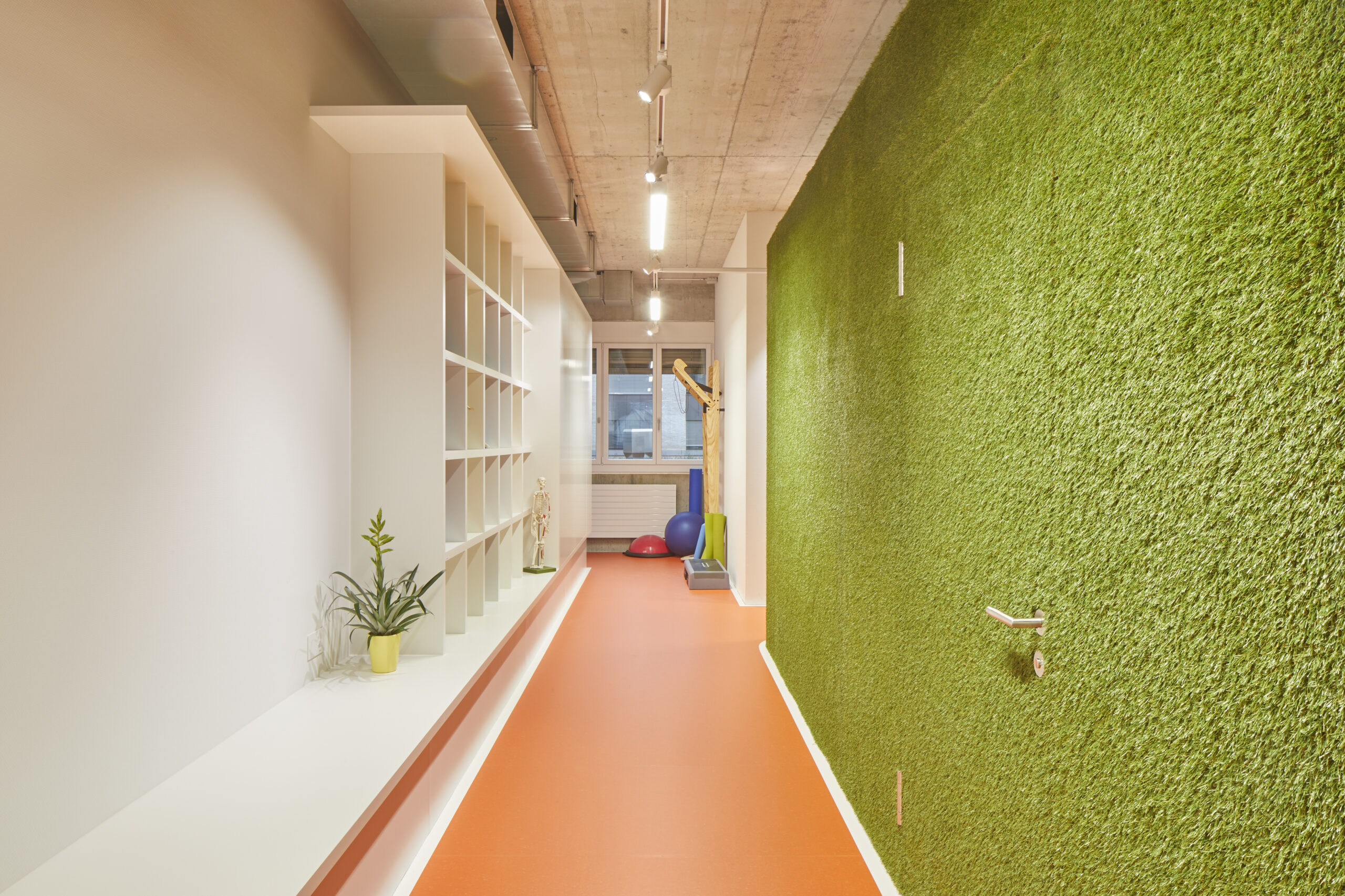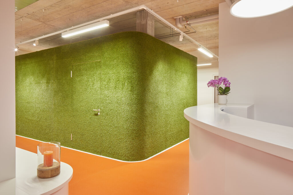 Beim Erstmieterausbau der Physiotherapie Artico AG lehnt sich das Konzept an das Bild eines Stadions an: der mittig eingestellte Nebenräume-Kubus wird mit Kunstrasen verkleidet und effektvoll mit Scheinwerfern ausgeleuchtet. Die darum angeordneten Behandlungszimmer sind über eine Laufbahn erreichbar. Der Wartebereich ist mit originalen Stadionstühlen ausgestattet und vermittelt mit den geschwungenen Einbauten die dynamischen Formen eines Stadions.