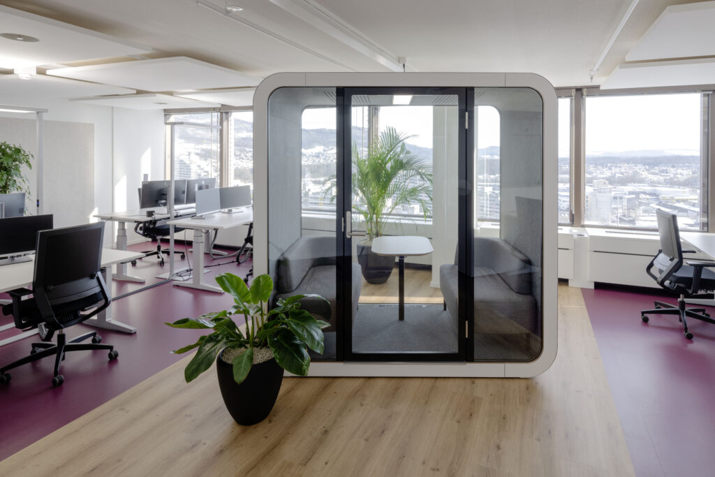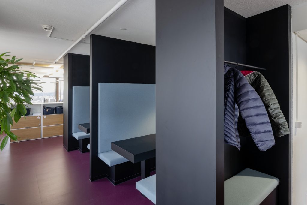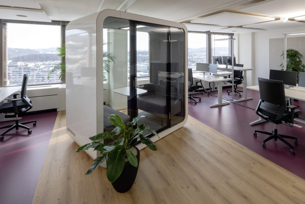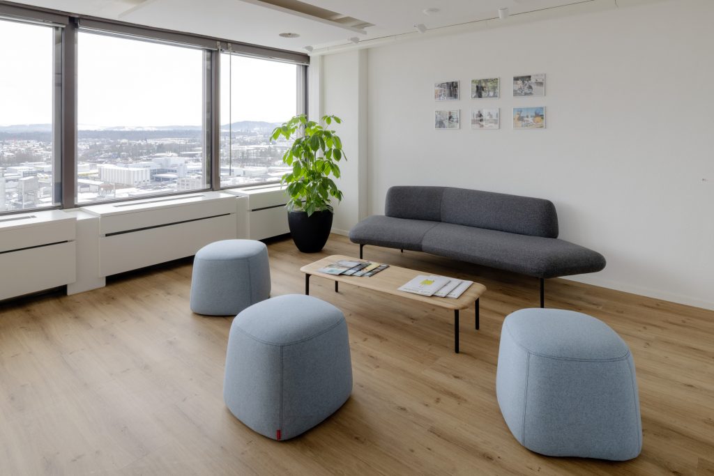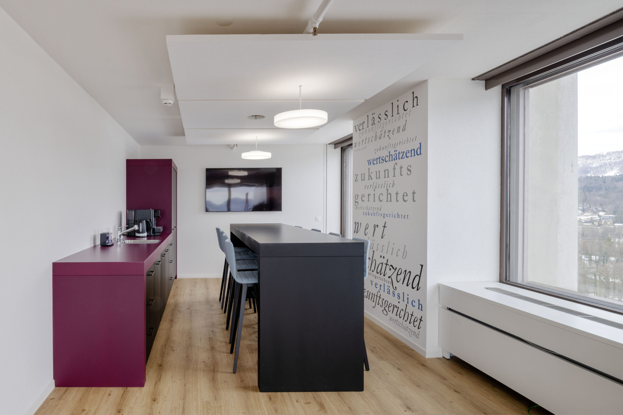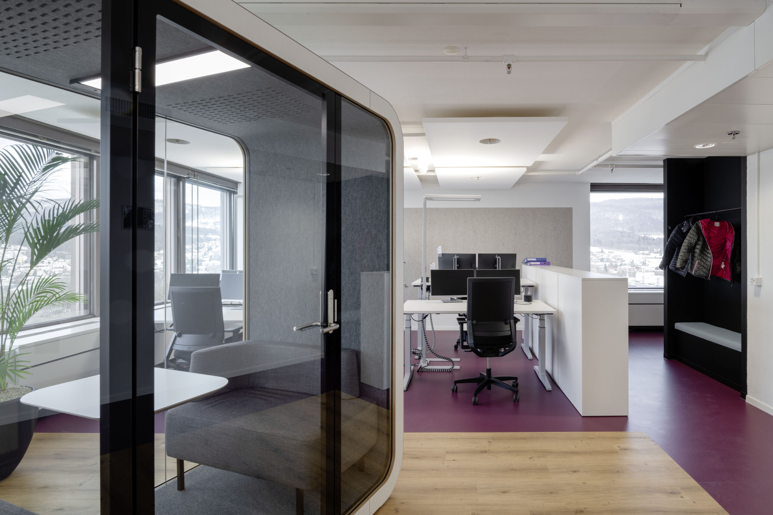 Das höchste Gebäude des Aargaus, das Telli-Hochhaus, wurde auf zwei Etagen vollständig umgebaut. Die kleinteilige Raumstruktur wurde komplett zurückgebaut, um damit ein neues Bürokonzept zu ermöglichen. Die entstandenen neuen Arbeitswelten überzeugen mit räumlich sehr hoher Qualität. Die neu ermöglichten «über-Eck-Perspektiven» spielen den Trumpf des Hochhauses gekonnt aus und bringen viel Licht und Weitblick in die Büroflächen.